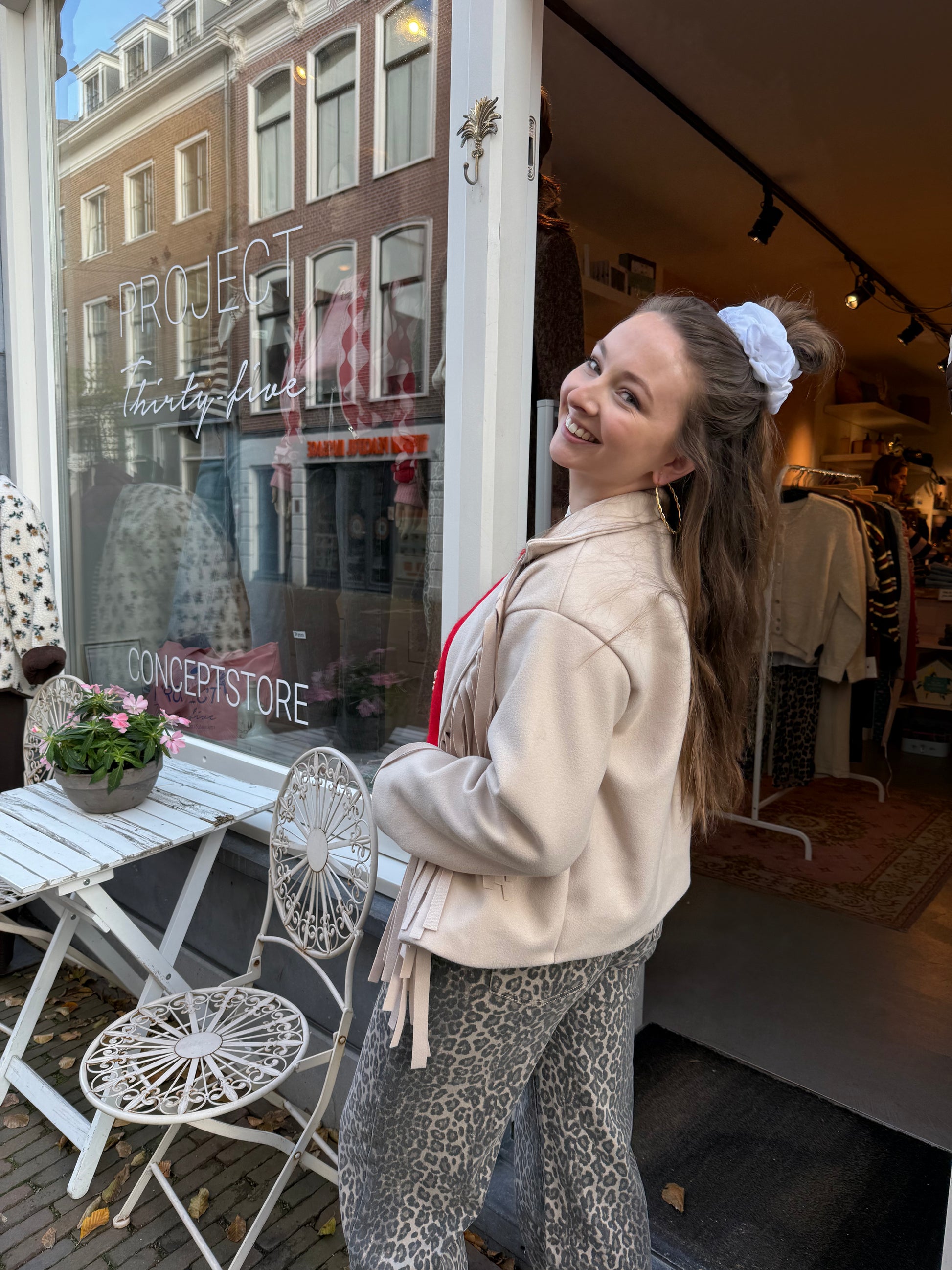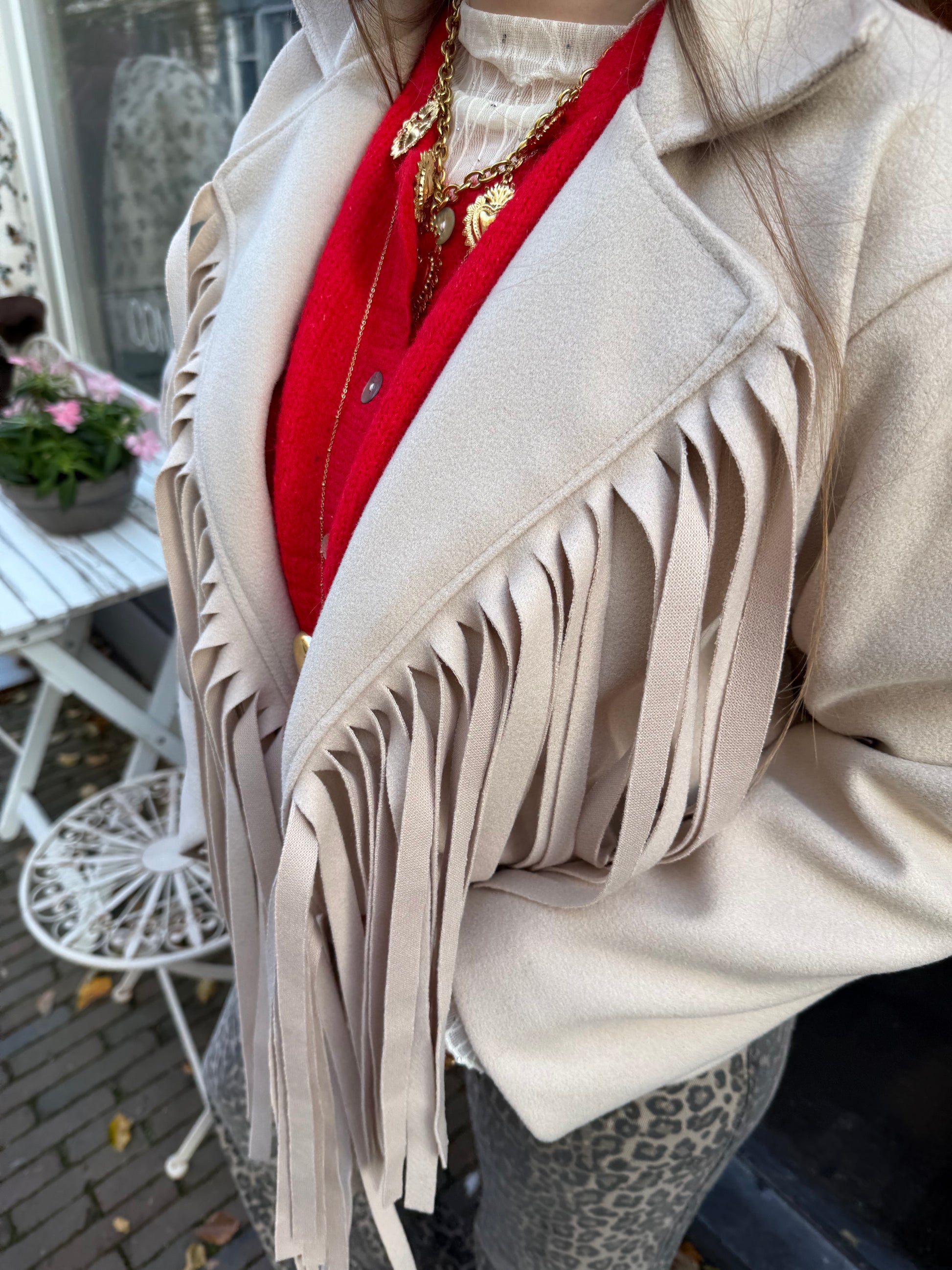 Hoe leuk is dit herfstjasje met franjes? Ideaal als tussenjasje en makkelijk te combineren!