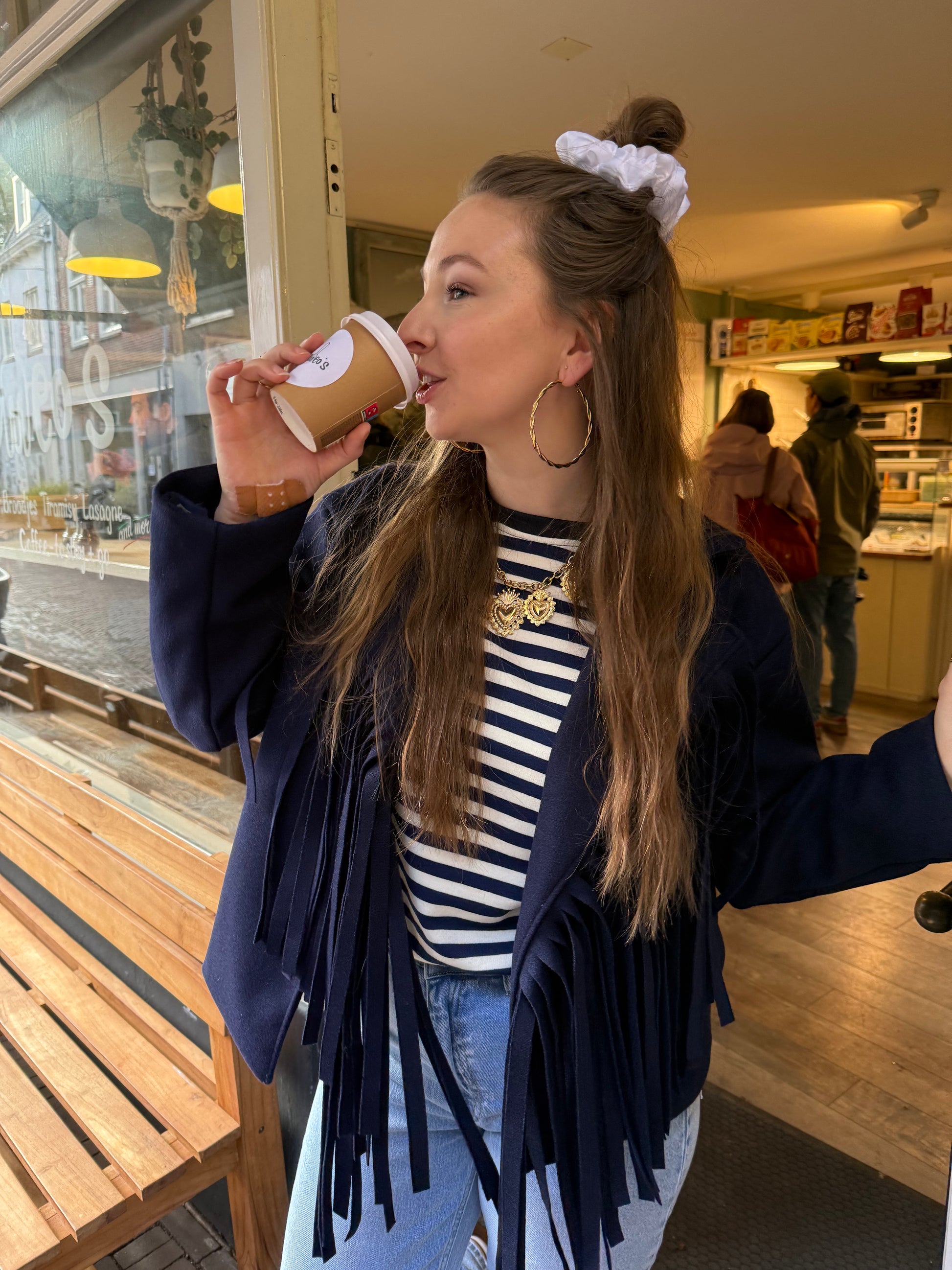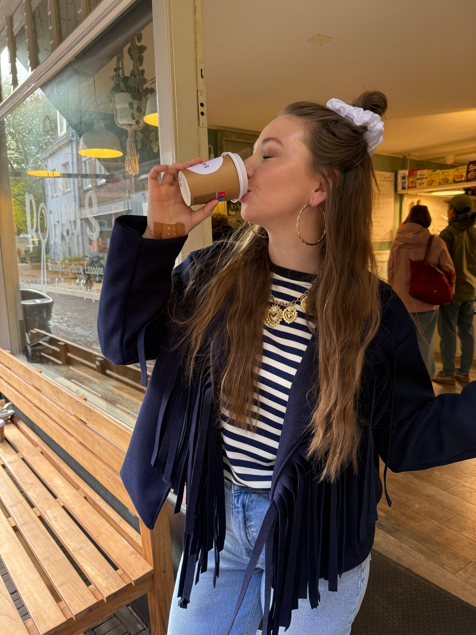 Hoe leuk is dit herfstjasje met franjes? Ideaal als tussenjasje en makkelijk te combineren!