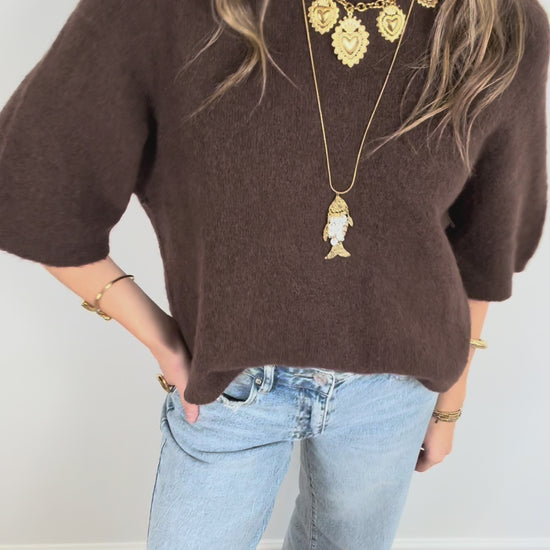 Onze heerlijke Bella knit is echt een heerlijk truitje voor de herfst en winter. Het truitje heeft een driekwart mouw en is gemaakt van een heerlijke zachte stof (kriebelt niet!).