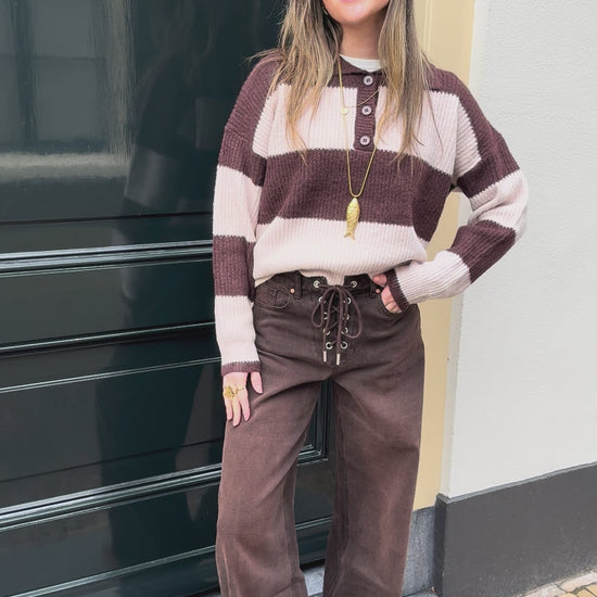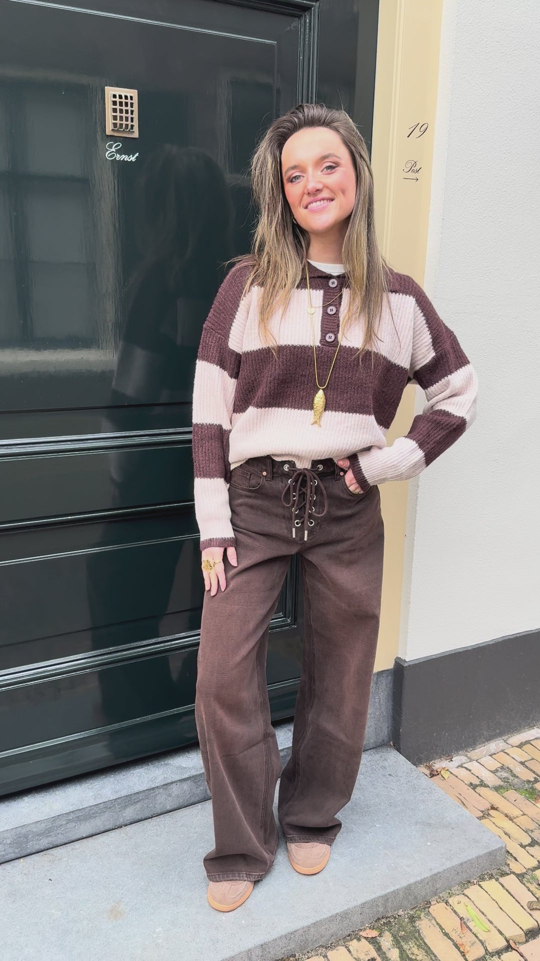 Een heerlijke zachte knit met een leuk kraagje en bruine/beige strepen. Dé musthave voor de herfst en winter! De stof kriebelt niet.