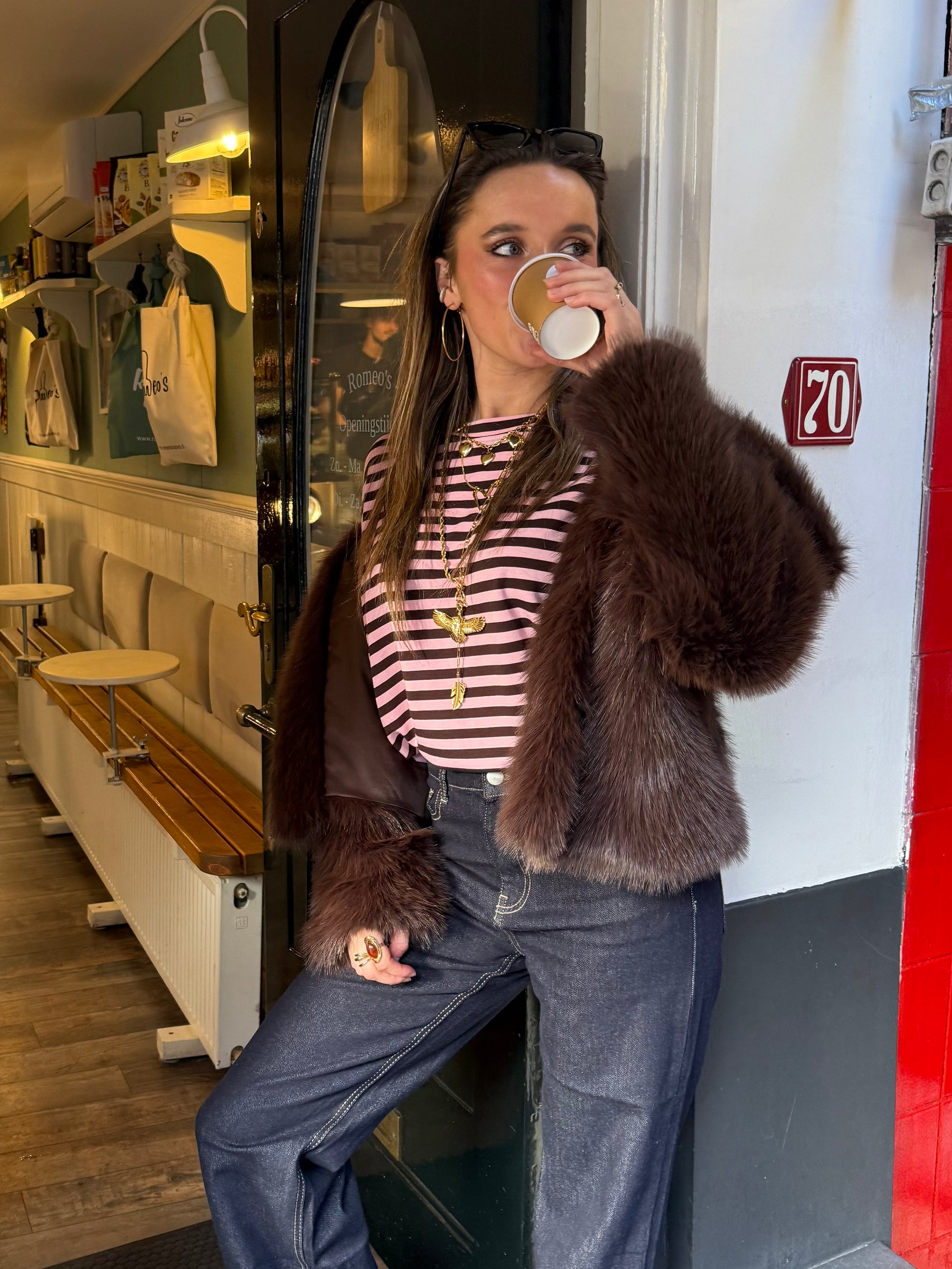 Hoe leuk is deze zachte en trendy faux fur jas! In een mooie donkerbruine kleur, heerlijk warm voor dit seizoen.