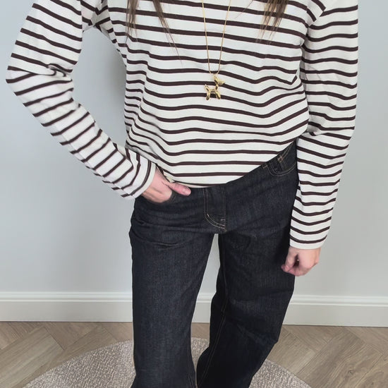 Een heerlijke longsleeve met donkerbruine strepen. Super leuk te combineren met ons bruine teddy gilet!
