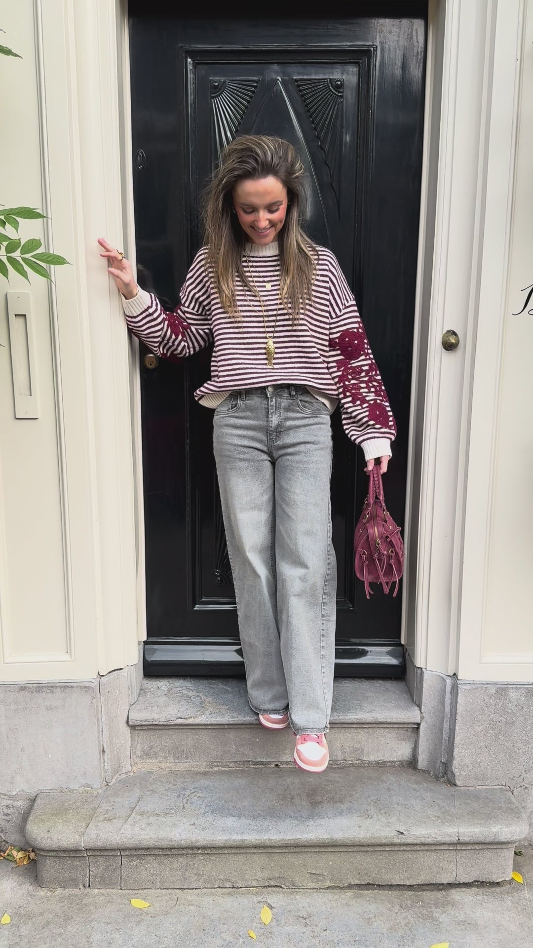 Ontdek onze Isabella knit: een bordeaux/witte gestreepte trui met prachtige geborduurde bloemen op de mouwen. De zachte stof en lichte oversized fit geven deze knit een chique, maar ook cozy look. De trui kriebelt niet. Perfect voor de herfst en winter!