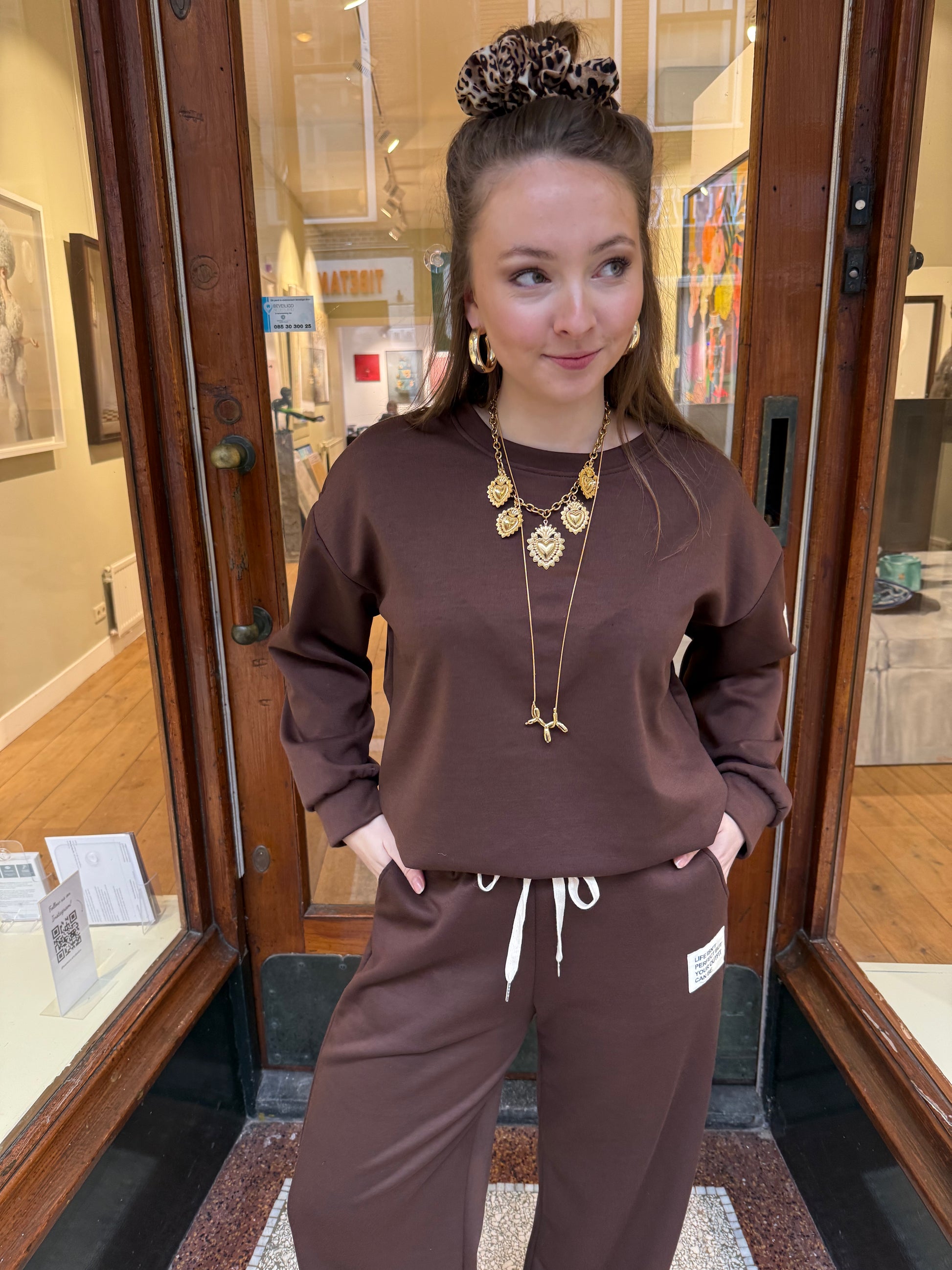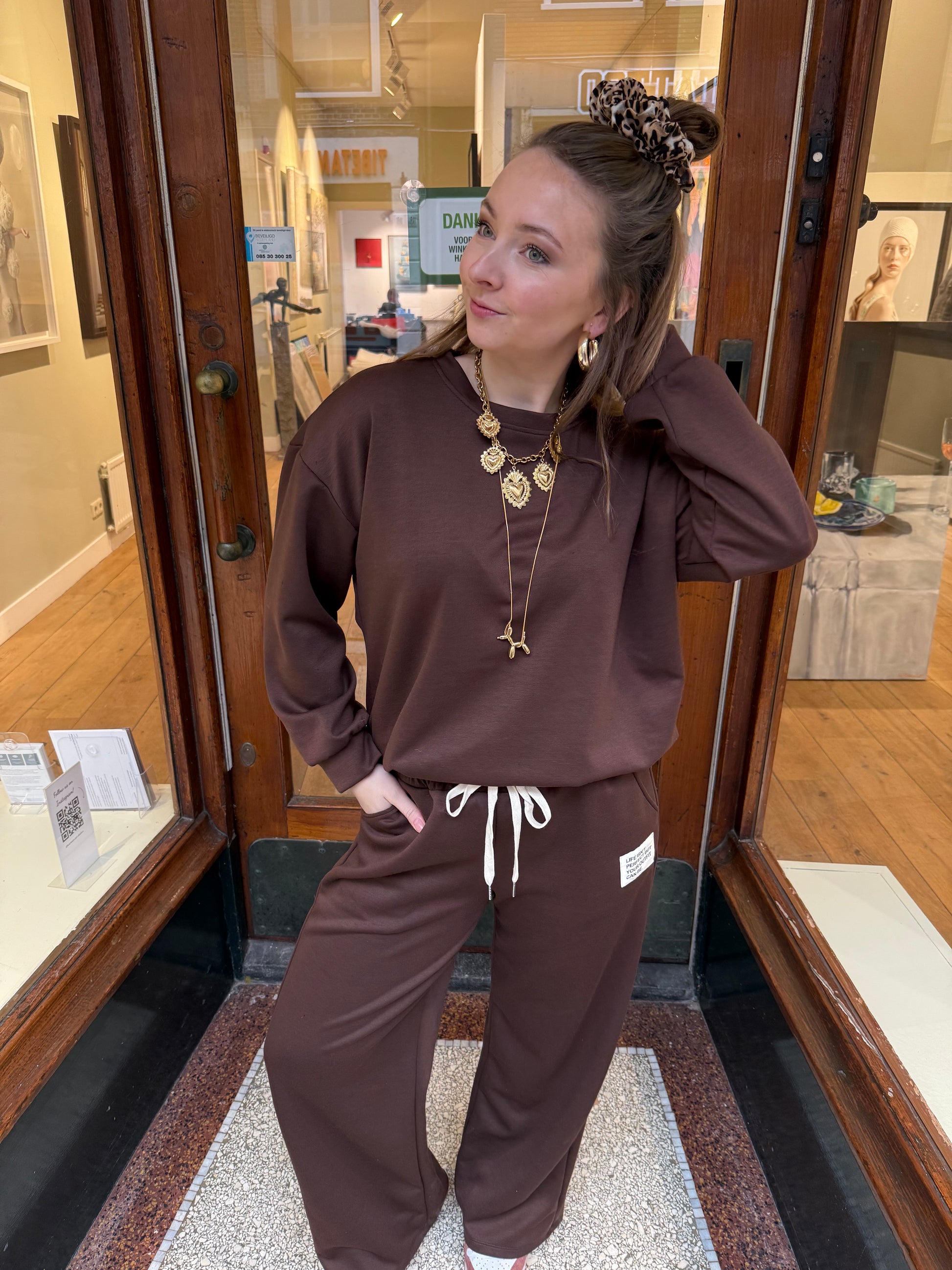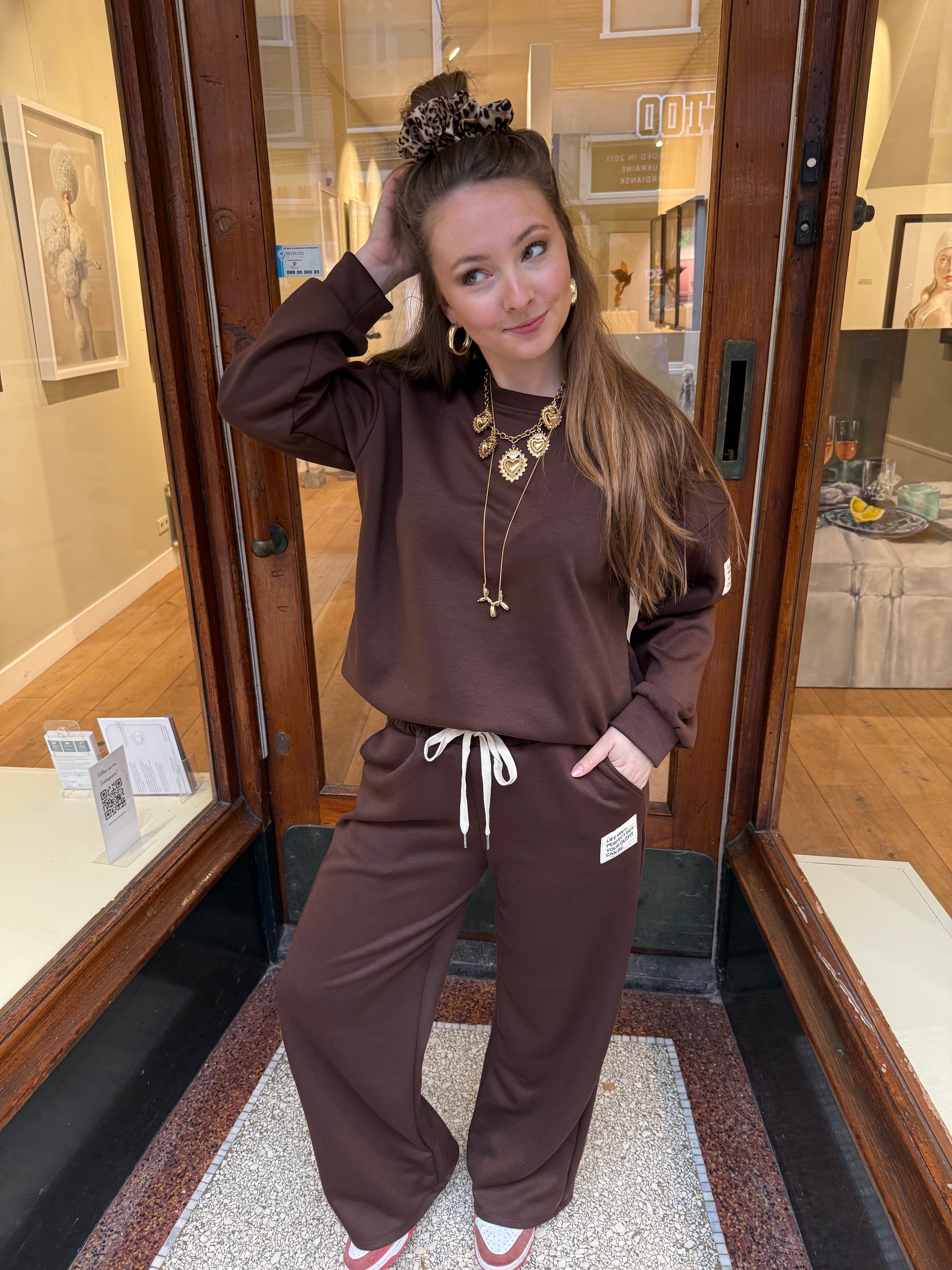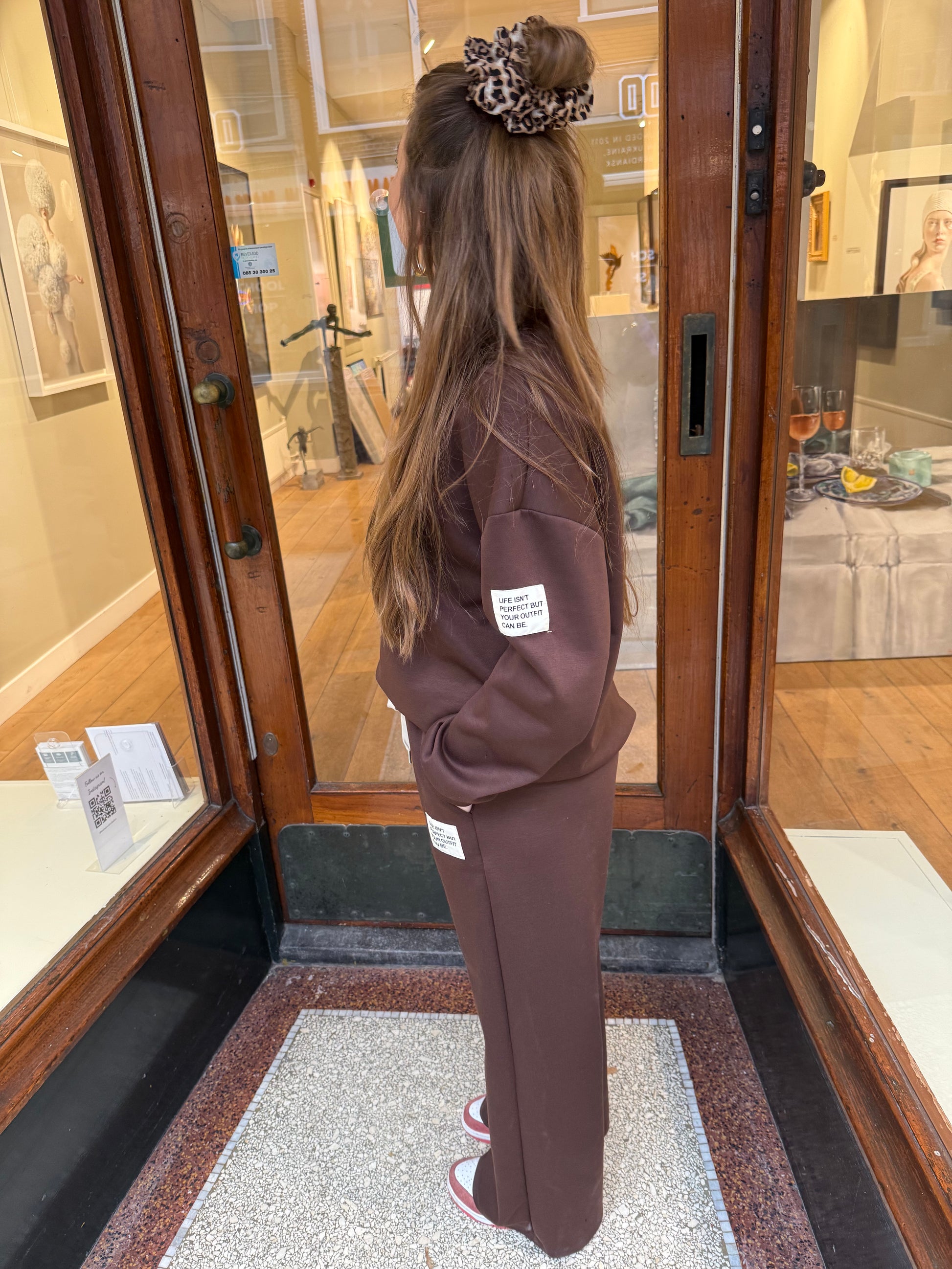 Comfy but cute! Dat zijn onze heerlijke jogging sets. Een fijne oversized sweater en mooie broek, die goed op lengte valt. Zowel de sweater als broek hebben een leuke patch.