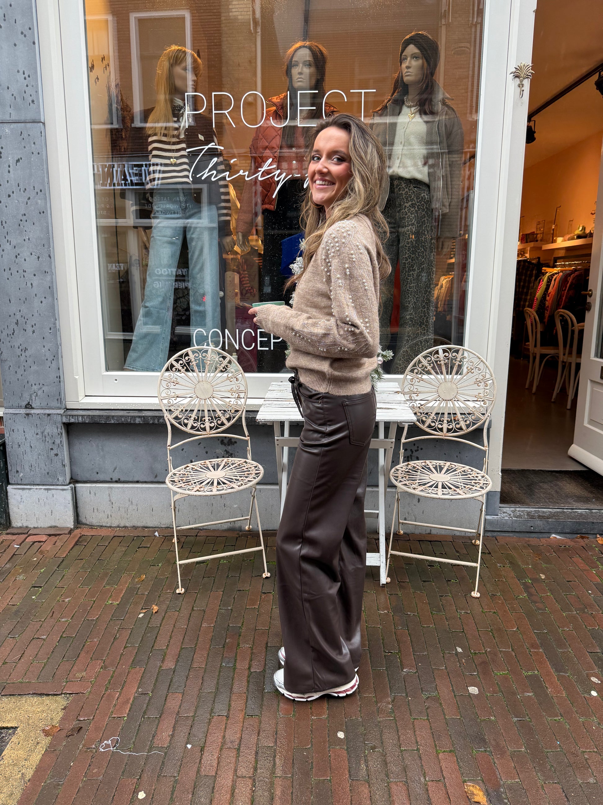 Dit is zo'n fijn wide leg broekje! Een prachtige pasvorm en de stof bevat stretch. Met een leuke veter aan de bovenkant voor net dat beetje extra. Een prachtige leather look stof in een donkerbruine kleur, perfect voor elke dag!