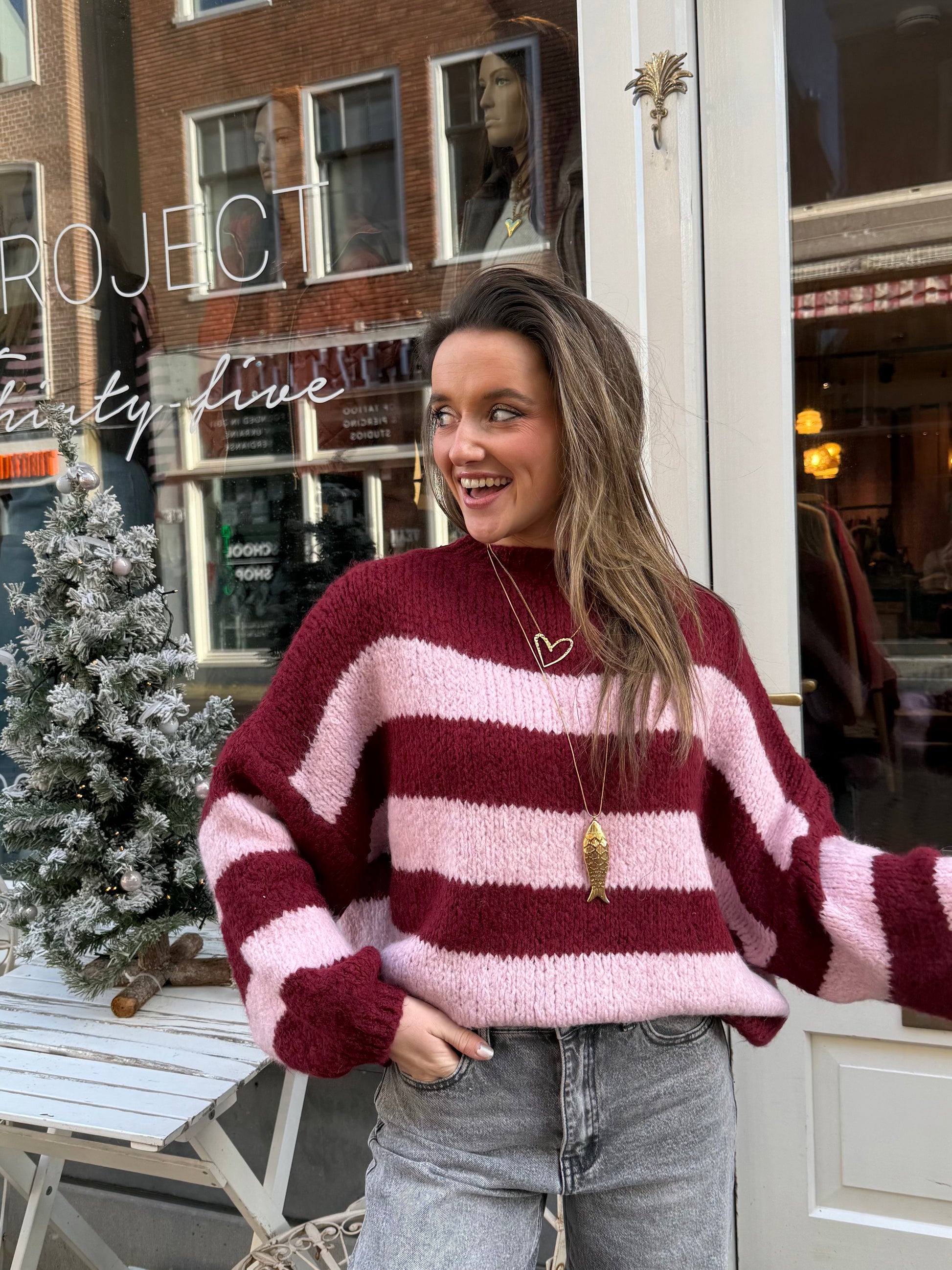 Onze Lena knit is zó zacht en warm! Met prachtige bordeaux en roze strepen, met een mooie oversized fit. Perfect voor op een jeans voor een casual outfit!