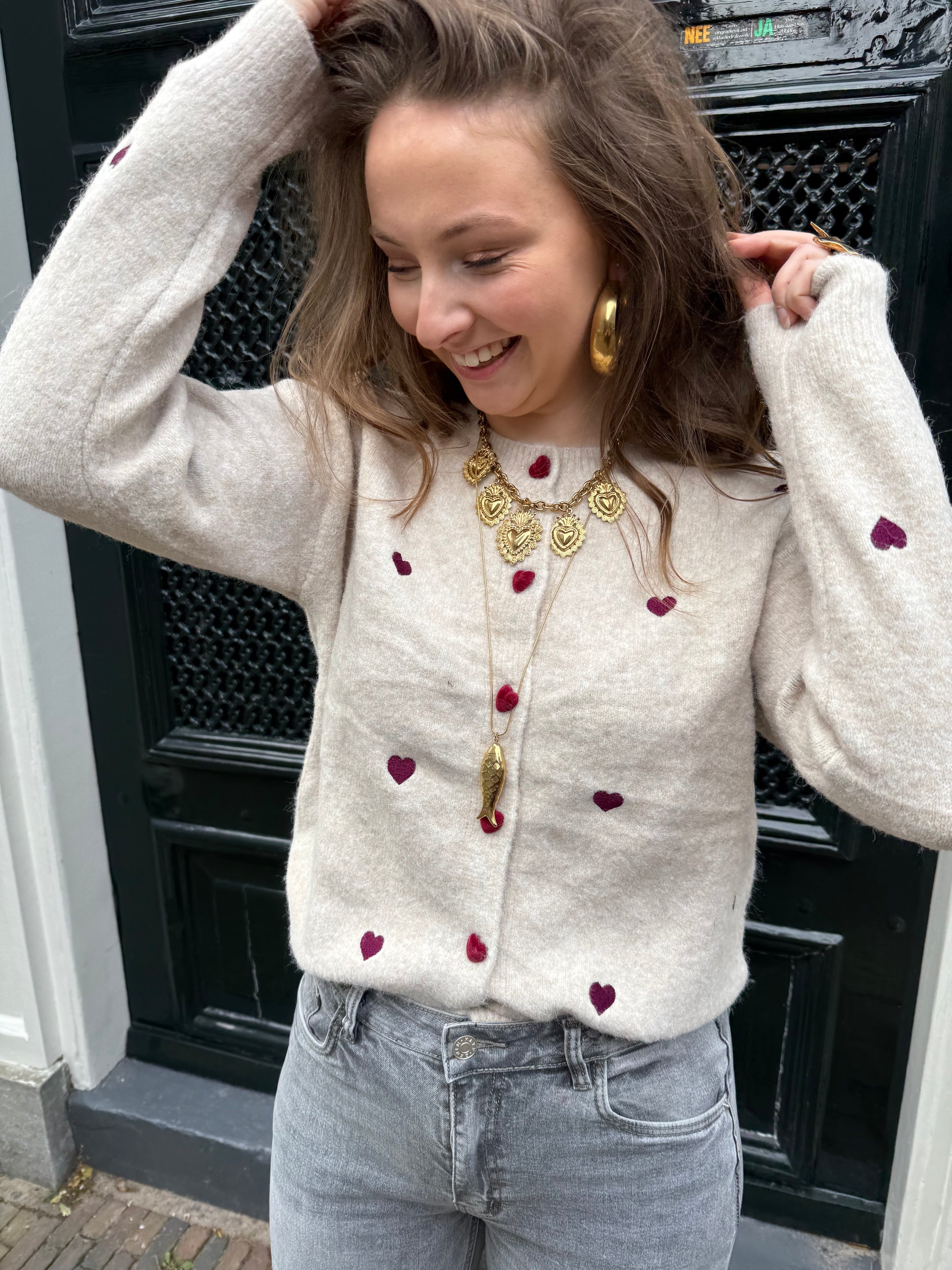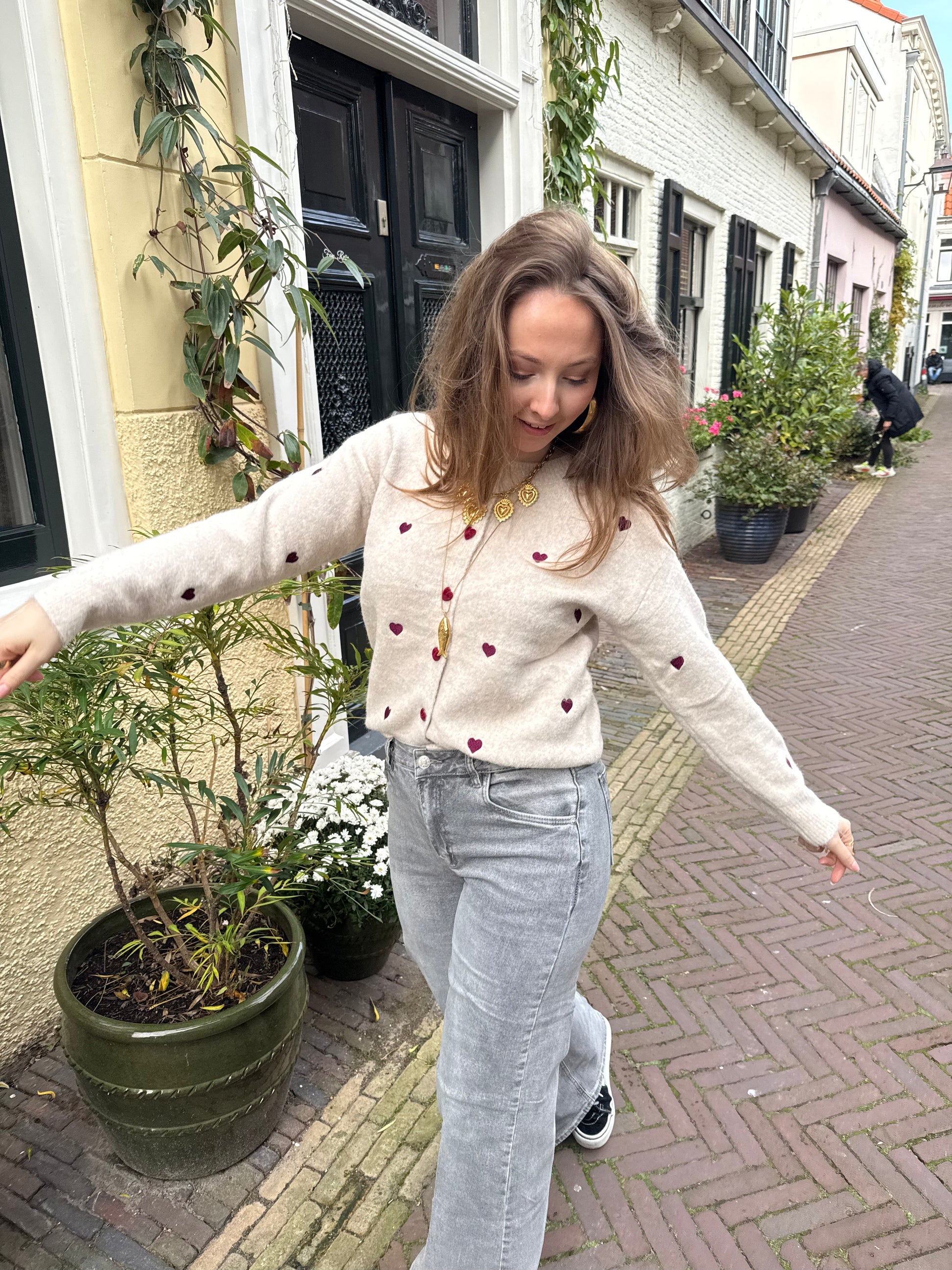 Hoe schattig is dit beige truitje met paarse hartjes en bordeaux knoopjes? Heerlijk zacht en ook open te dragen als vestje.