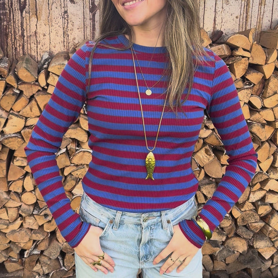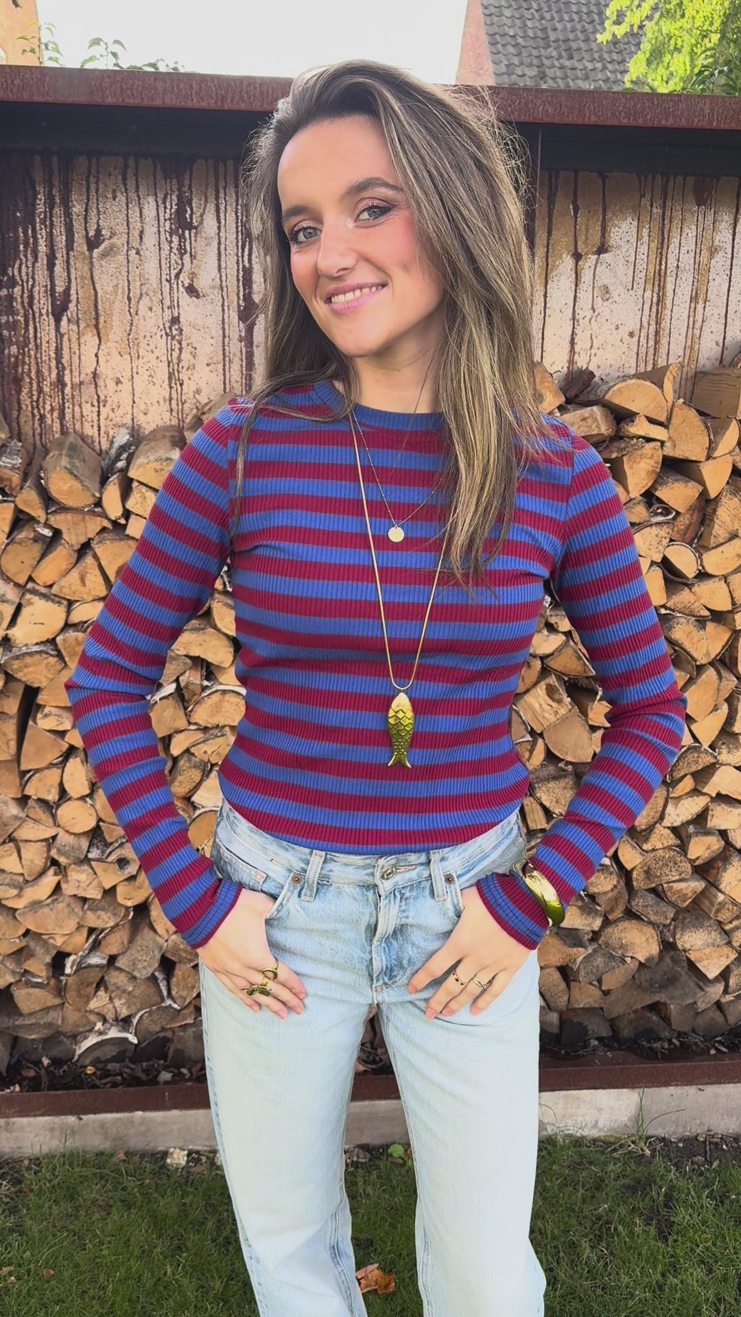 Onze Nola top is een prachtige aansluitende longsleeve met strepen in kobalt en bordeaux. Het ribstofje geeft de top een luxe uitstraling. Kortom, de perfecte top voor de herfst!