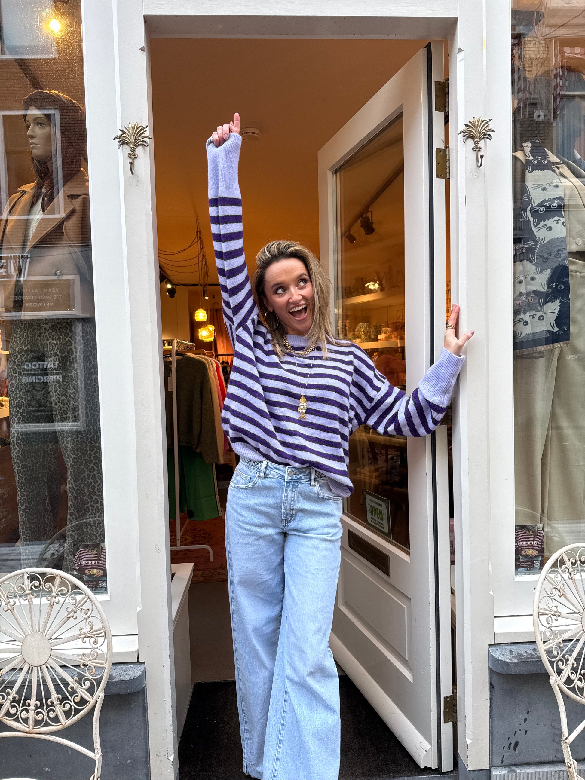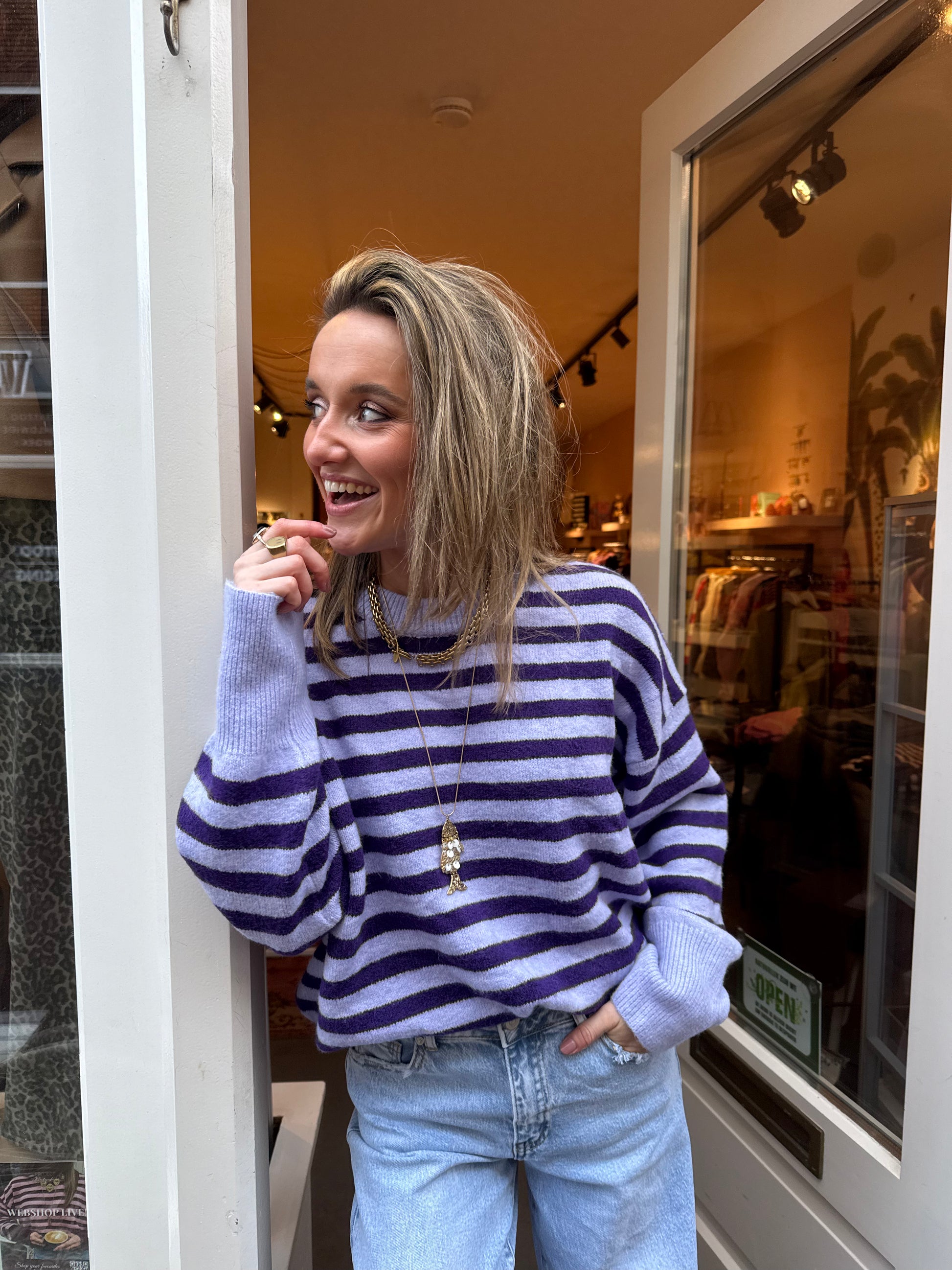 Onze bestseller Pippa trui in deze prachtige paarse kleurencombinatie... De trui valt oversized en heeft mooie lange mouwen.