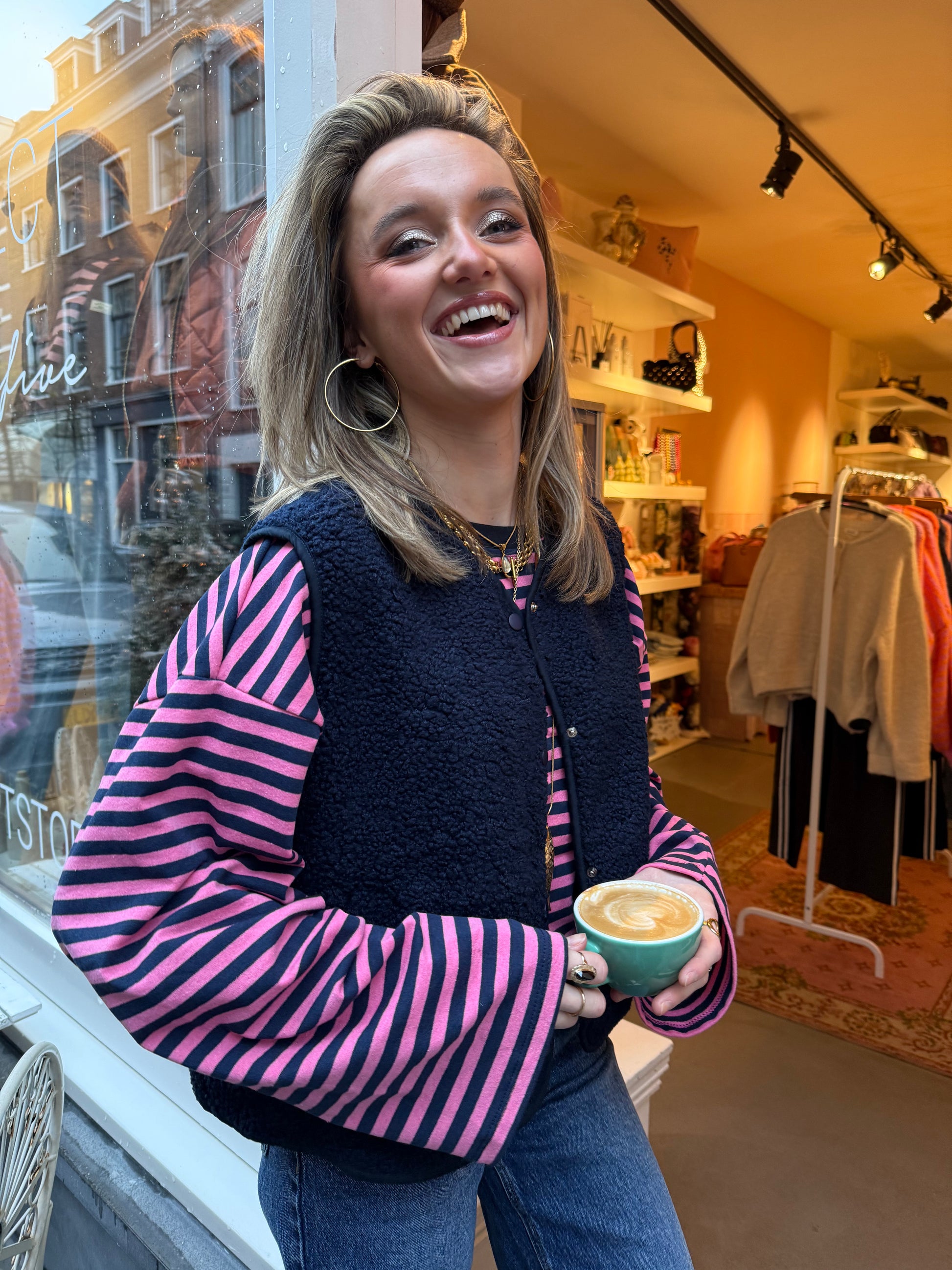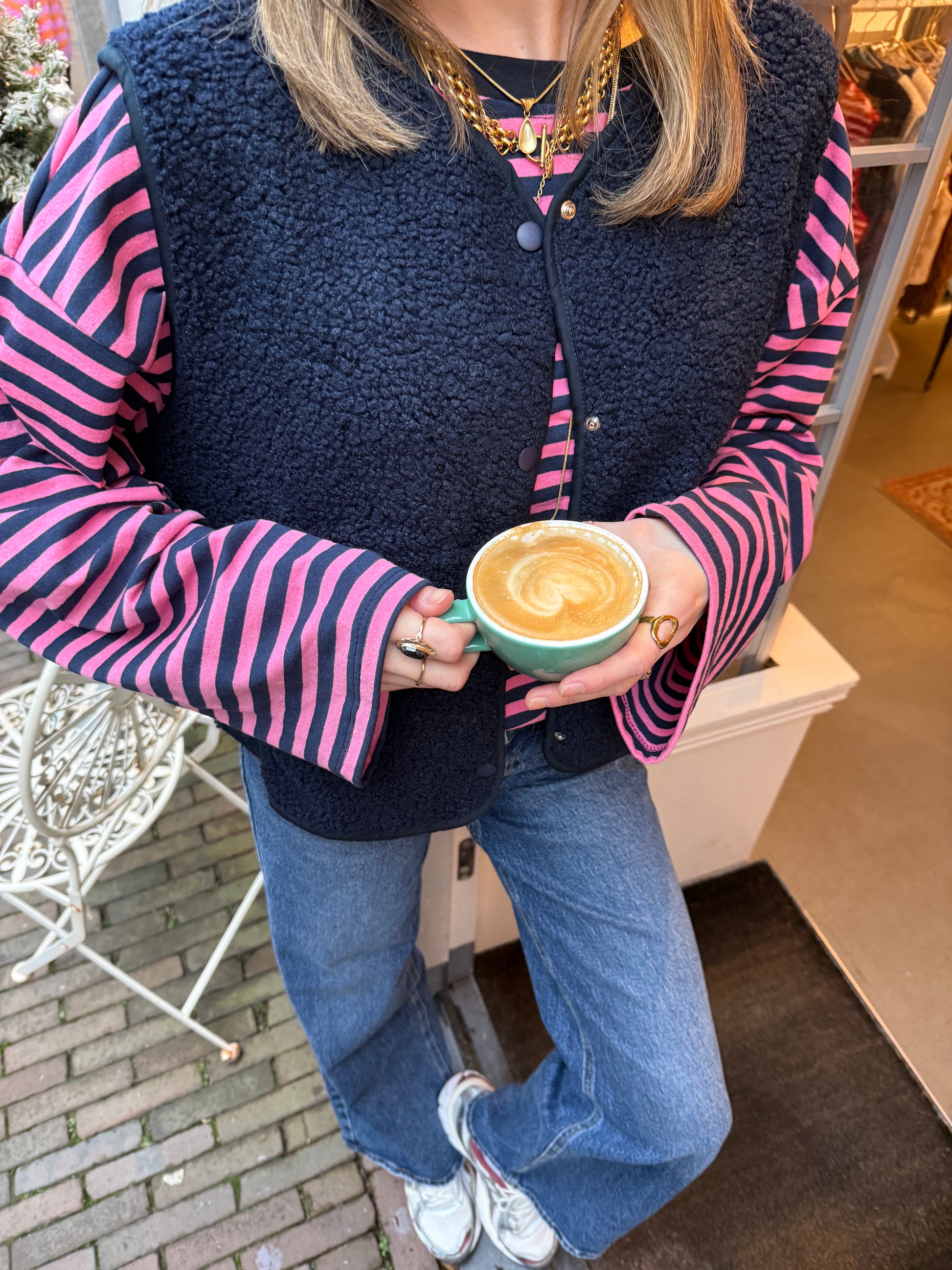 Tip: draag het gilet met onze Maud longsleeve pink/navy!