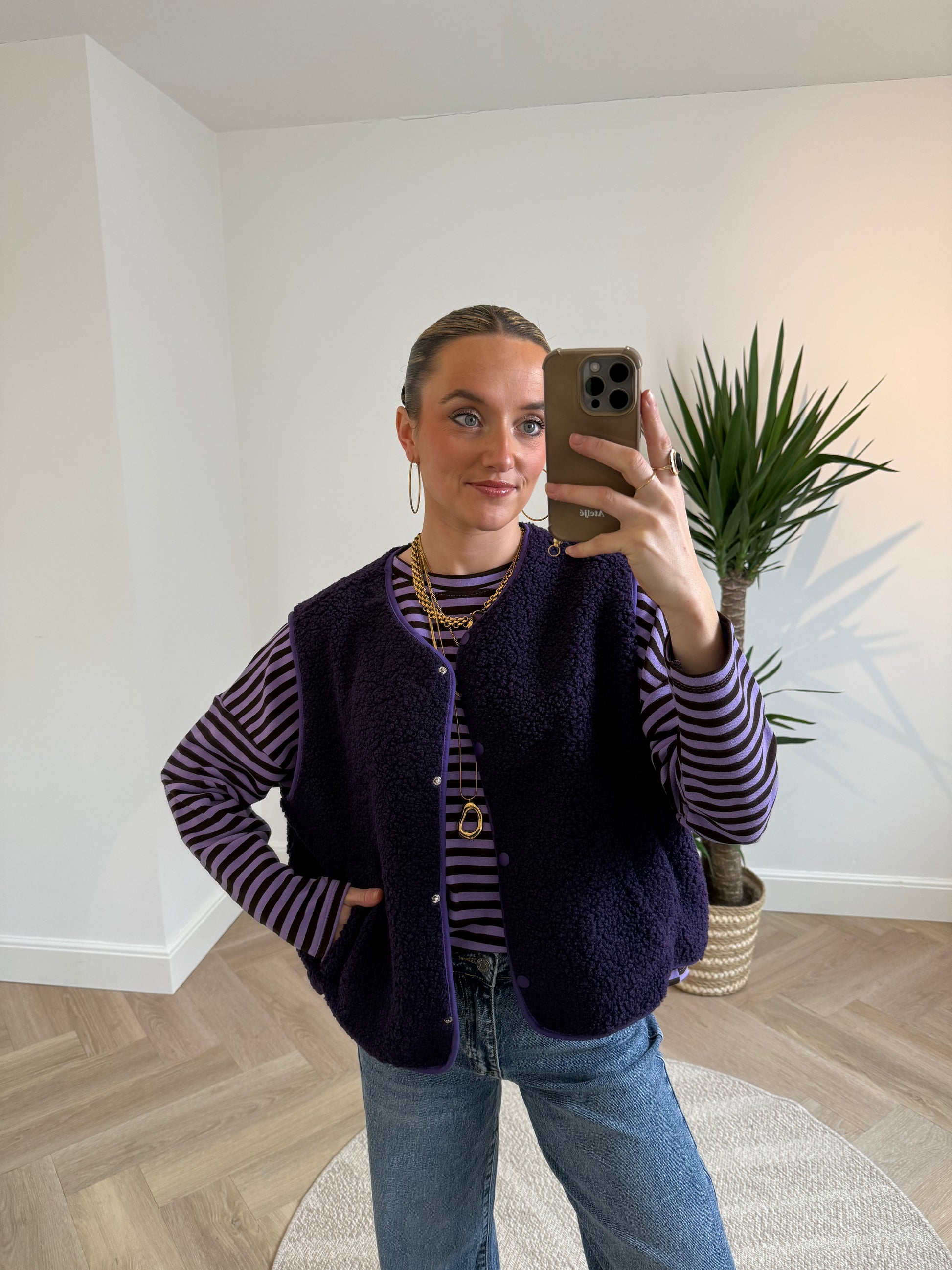 Tip: draag het gilet met onze Roos longsleeve paars/bruin.