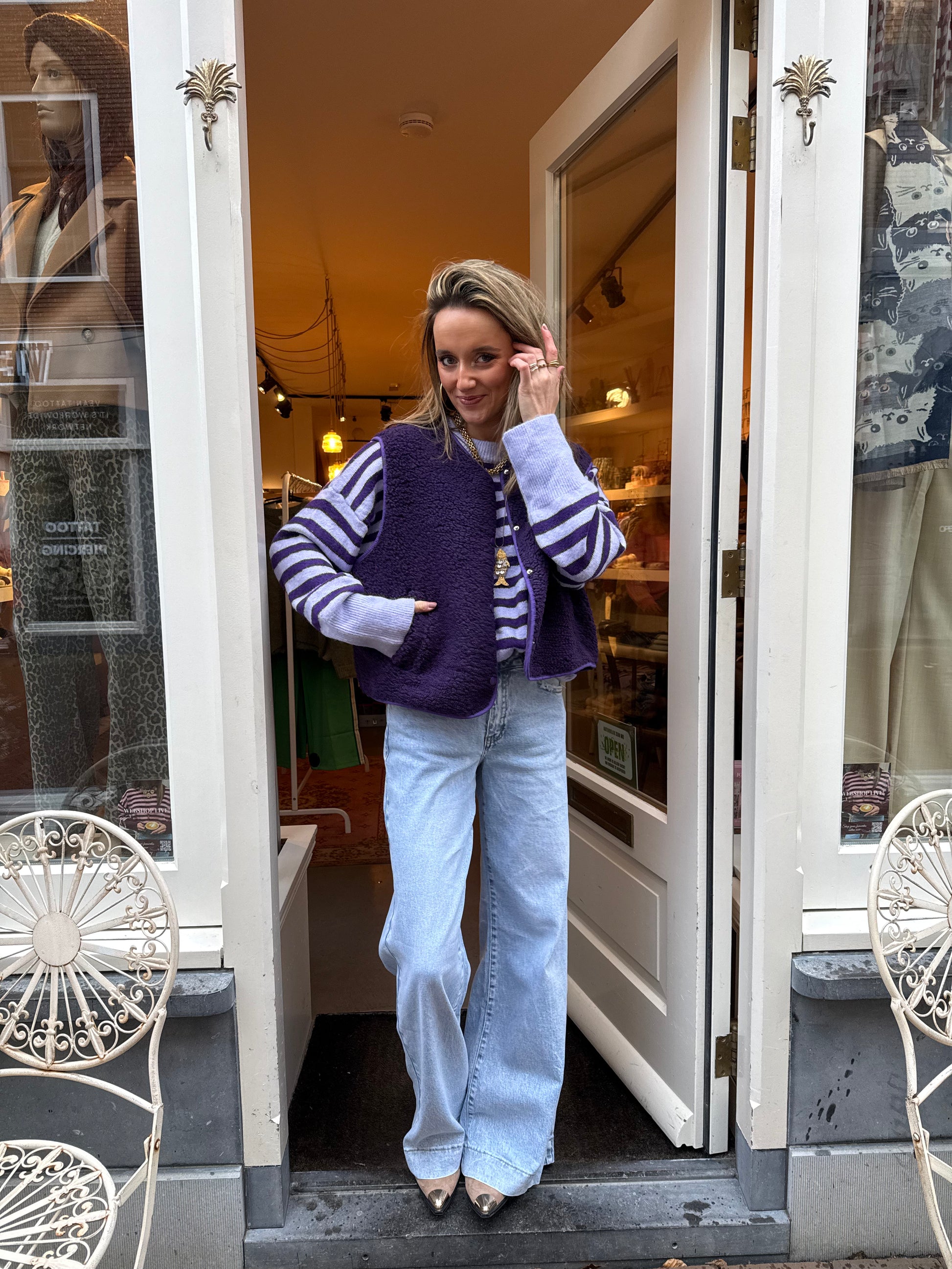 Tip: draag het gilet met onze Pippa trui in de paarse kleur.