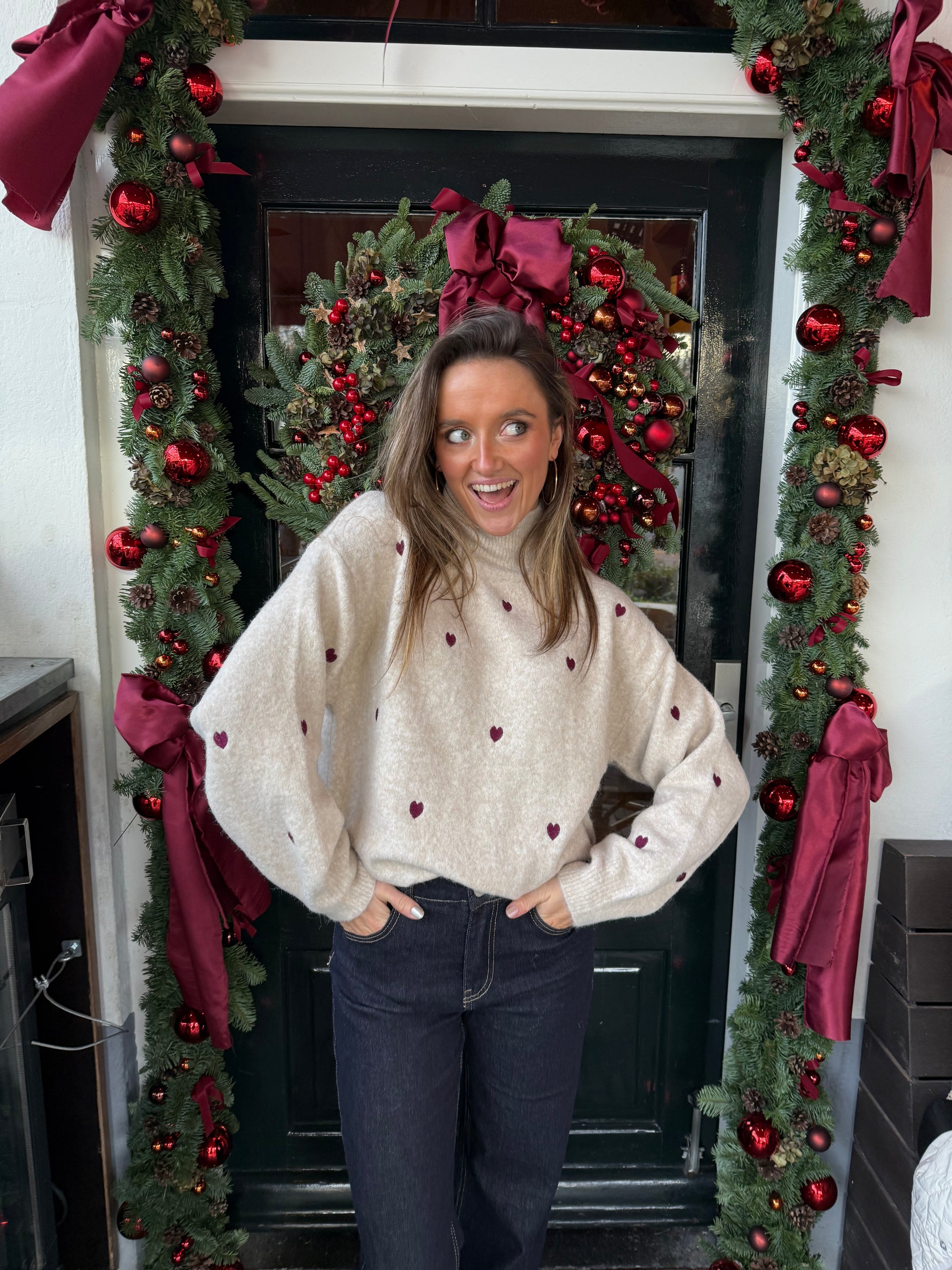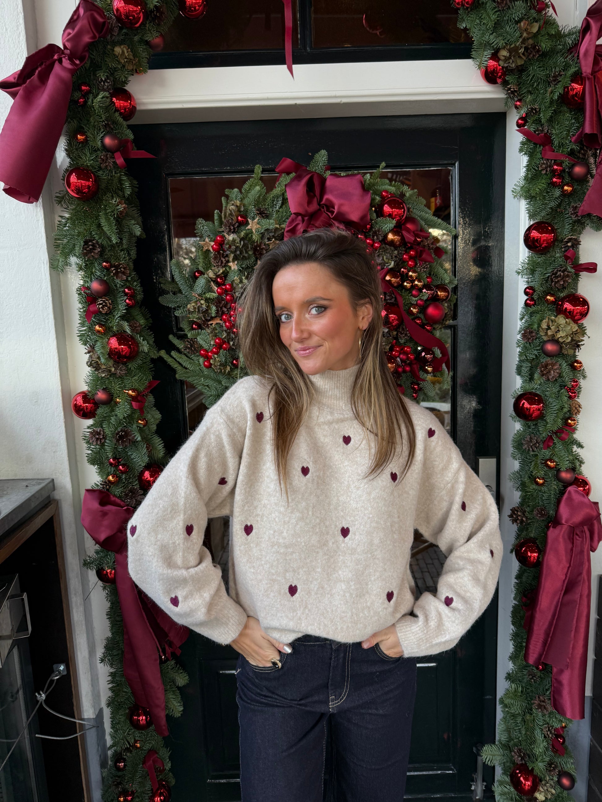 Comfy & cute: dat is onze Vivi trui! Gemaakt van een heerlijke zachte stof in een mooie beige kleur met bordeaux hartjes. Lekker warm voor de herfst en de winter!